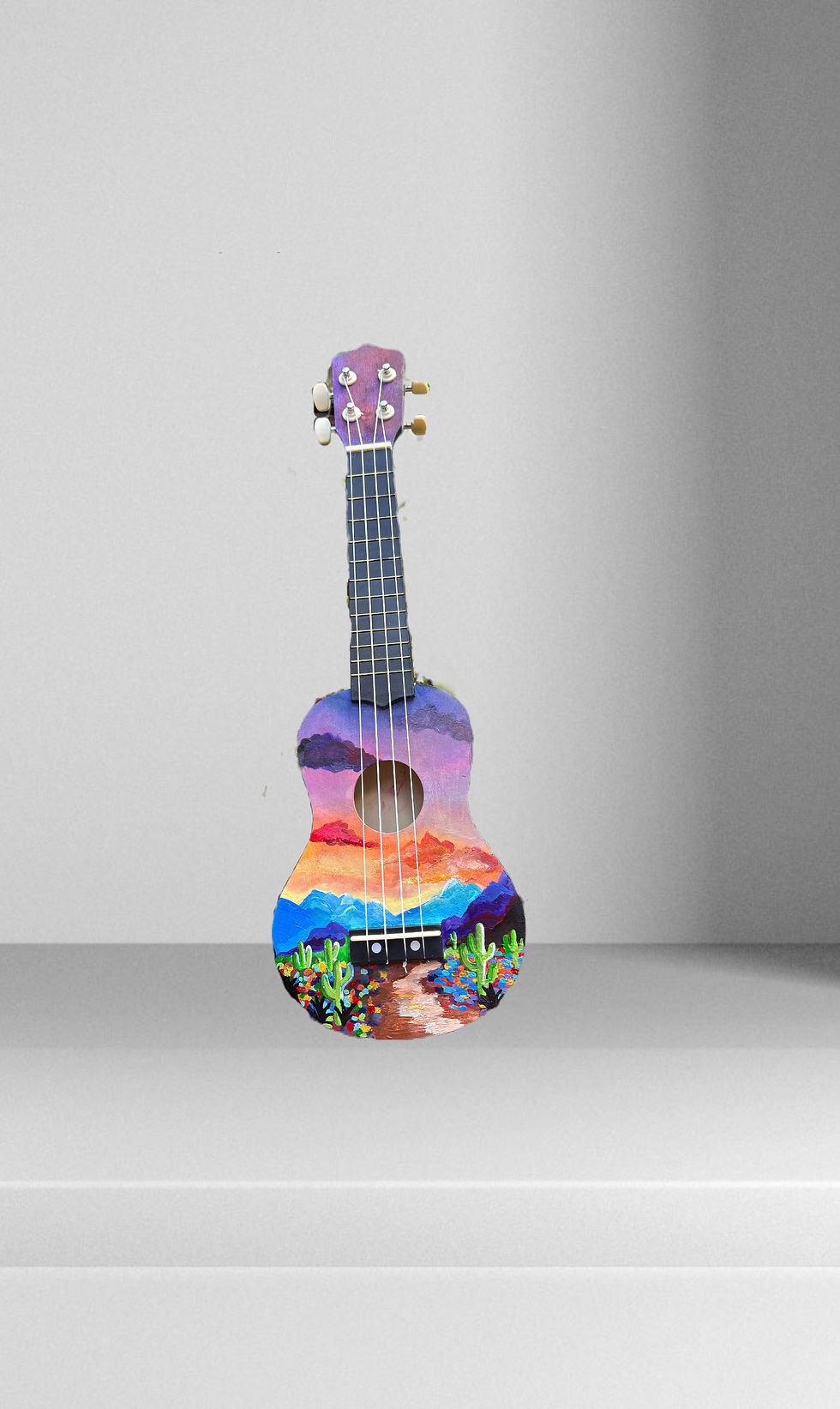 Infuse your melodies with the spirit of the desert. This hand-painted ukulele, with its unique desert theme, is a one-of-a-kind instrument. The 21-inch ukulele is a handcrafted piece of art, designed to be both a beautiful display piece and a joy to play.
